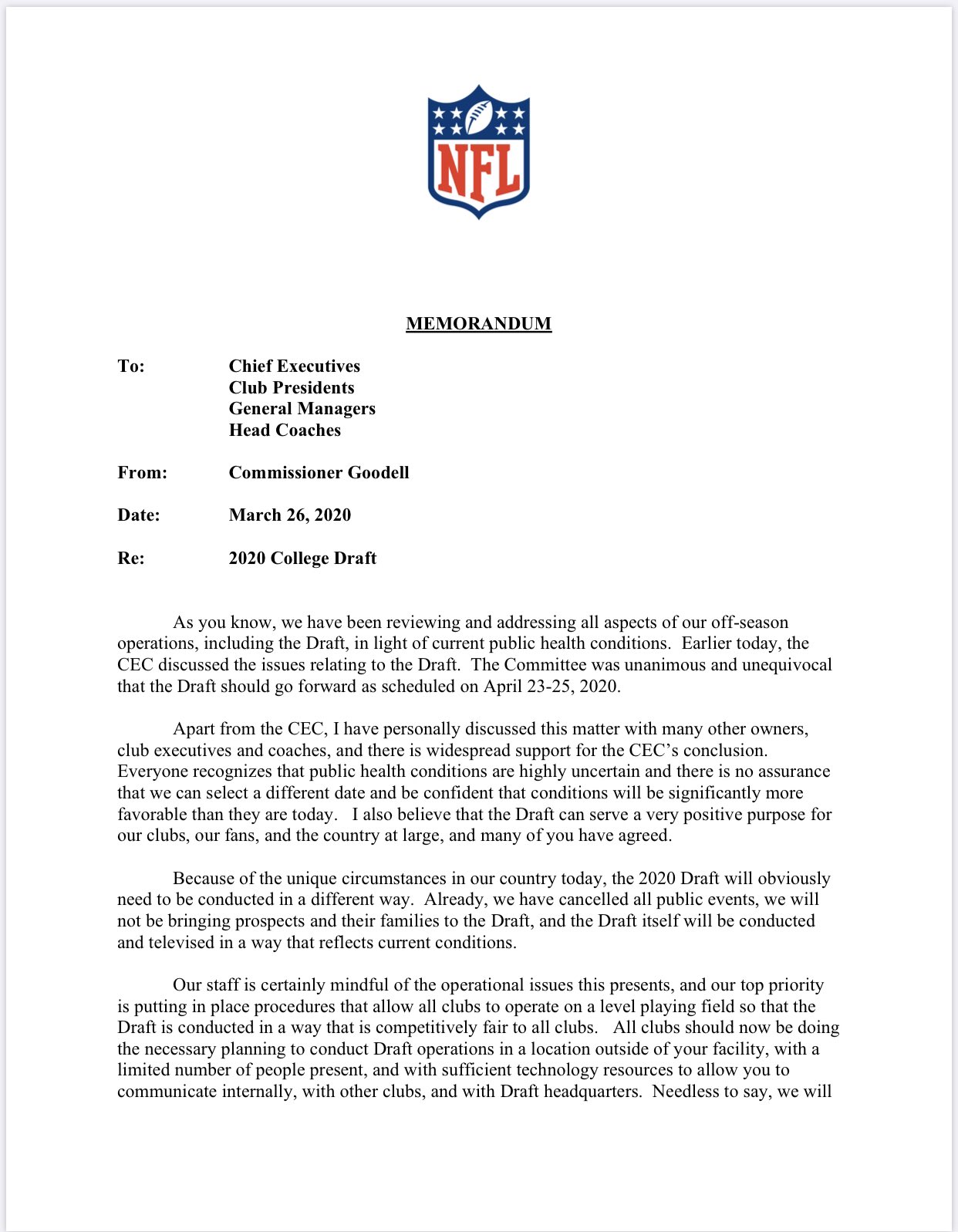 Adam Schefter On Twitter Commissioner Goodell Sent Out A Memo To Nfl Teams Tonight That The Draft Will Go On April 23 25